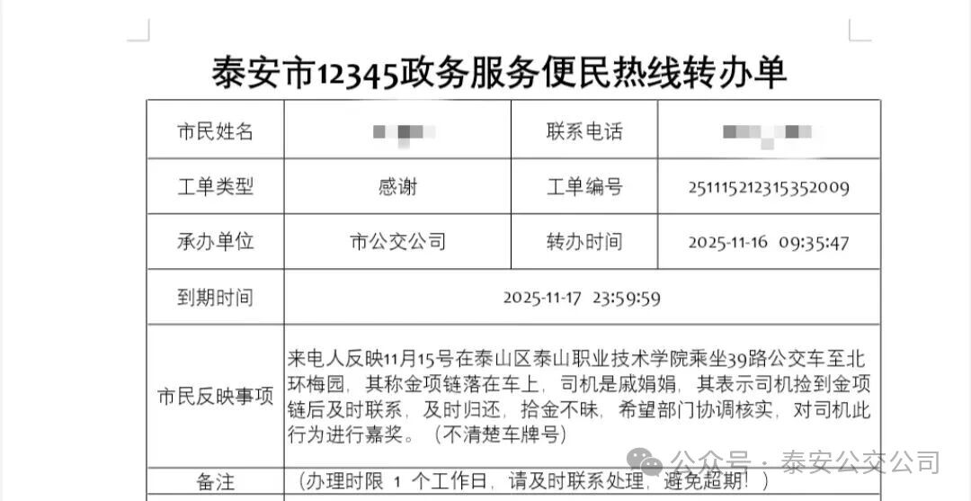 2025年11月16日,泰安市民趙女士通過泰安市12345政務(wù)服務(wù)熱線,向39路公交車駕駛員戚娟娟致以誠摯感謝,為其拾金不昧的暖心舉動點(diǎn)贊。
