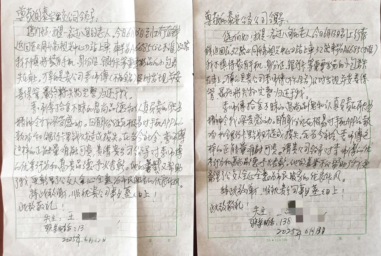 當天,王大娘順利領(lǐng)回失物。她感慨道:“李師傅不僅拾金不昧,還主動(dòng)聯(lián)系、妥善保管,讓我這八旬老太太心里特別暖。”為表謝意,老人特意手寫(xiě)感謝信,一份致謝公交公司,一份致敬李師傅,用質(zhì)樸的文字傳遞社會(huì )正能量。