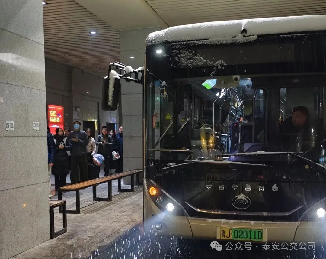 當(dāng)日,泰城遭遇降雪天氣,強(qiáng)降雪導(dǎo)致路面濕滑難行,受降雪天氣影響多趟高鐵列車晚點(diǎn),大量乘客出行需求異常迫切。按照泰安公交安排部署,為全力保障乘客出行暢通,泰安公交第五分公司迅速啟動(dòng)應(yīng)急保障機(jī)制,第一時(shí)間強(qiáng)化與高鐵站的信息聯(lián)動(dòng),安排專人實(shí)時(shí)對(duì)接列車晚點(diǎn)及旅客聚集情況,精準(zhǔn)調(diào)度、增派運(yùn)力,用責(zé)任與堅(jiān)守搭建起風(fēng)雪中的“暖心通道”。