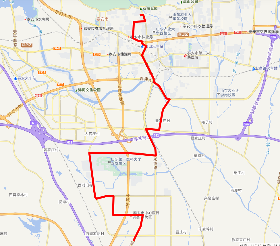 優(yōu)化調(diào)整后30路首末站變?yōu)樯硯X石敢當小鎮(zhèn)和山東農(nóng)業(yè)大學泮河校區(qū)運行路線為沙嶺石敢當小鎮(zhèn)—開明路—大津口鄉(xiāng)—泰明路—天燭峰路—靈山大街—上高東路—泮河大街—山東農(nóng)業(yè)大學泮河校區(qū);山東農(nóng)業(yè)大學泮河校區(qū)—泮河大街—上高東路—靈山大街—天燭峰路—泰明路—大津口鄉(xiāng)—開明路—沙嶺石敢當小鎮(zhèn)優(yōu)化調(diào)整后運行路線圖如下: